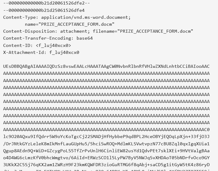 Podemos ver que hay un archivo adjunto en el correo electrónico, pero está codificado en base64. Si usamos cyberchef, podemos ver el contenido y notar que tiene el número mágico PK al principio. Según esta lista https://gist.github.com/leommoore/f9e57ba2aa4bf197ebc5, podemos ver que es un archivo pkzip. Guardemos el archivo con la extensión .zip.