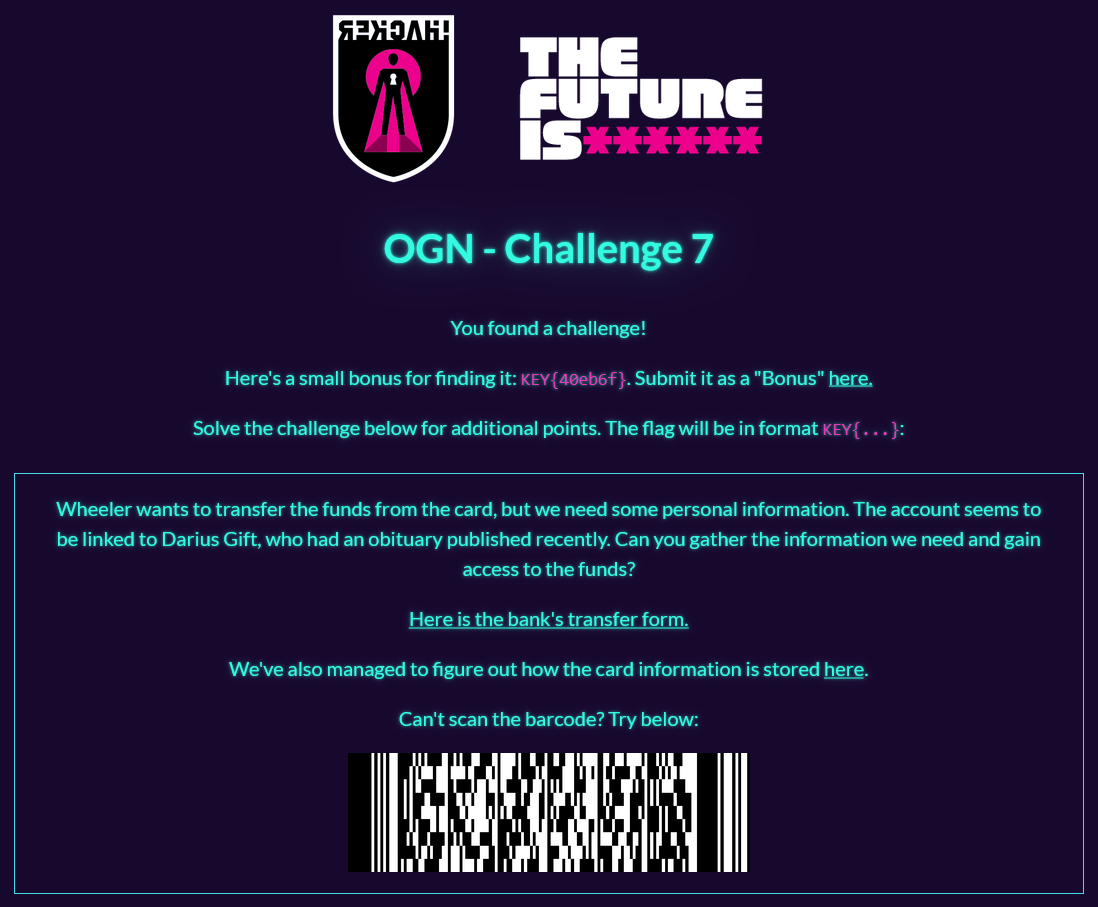 Ahora que tenemos la información de la tarjeta, intentemos realizar la transferencia. Visitamos https://challenges2.tficomic.io/ogn-chal7/ para ingresar el número de cuenta que obtuvimos de la tarjeta. Debido a recientes intentos de fraude, todas las transferencias requieren completar preguntas de seguridad. Para encontrar las respuestas, debemos consultar el obituario de Darius Gift en la página 77.