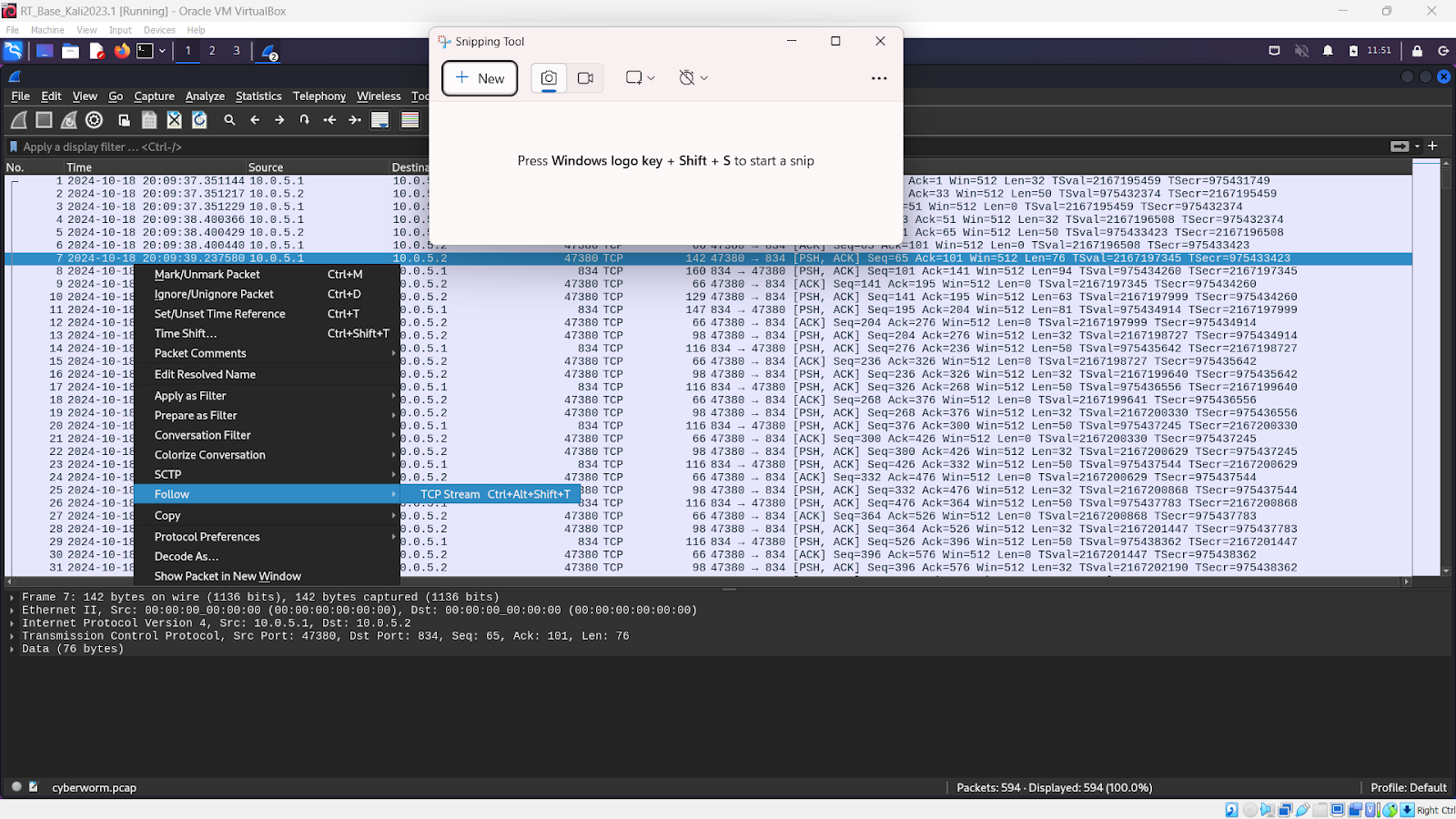 Con el archivo pcap abierto y revisando el flujo TCP, podemos ver algunos mensajes que indican "Violación de integridad en la región de memoria". Estos mensajes terminan con una letra o un número entre paréntesis. Si los anotamos, podemos encontrar la bandera.
