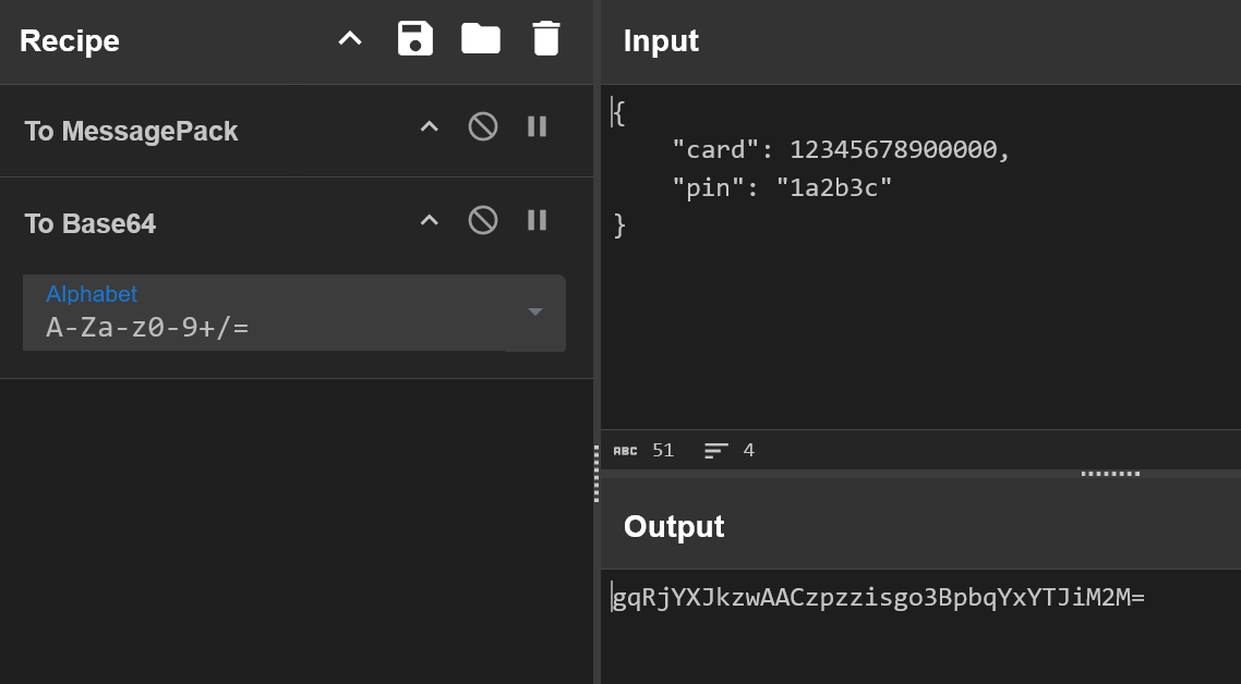 El código de barras tiene un string en base64. En la página del desafío, también vemos una receta de Cyberchef sobre cómo la tarjeta almacena datos: https://challenges2.tficomic.io/ogn-chal7/encoder.py. Para obtener la información de la tarjeta, debemos invertir el proceso. Primero, debemos decodificar la cadena en base64 y luego en MessagePack.