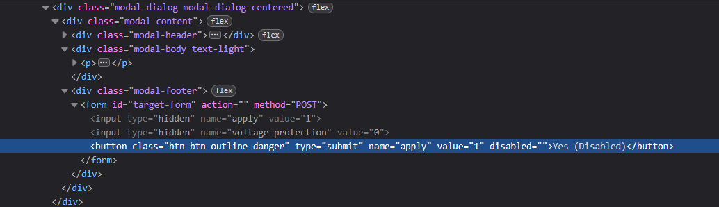 Al inspeccionar el botón con las herramientas de desarrollo (Mayús+F12), podemos ver la etiqueta "disable="". Activemos el botón eliminando la etiqueta por completo.